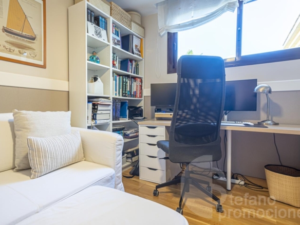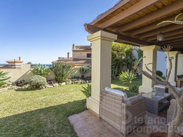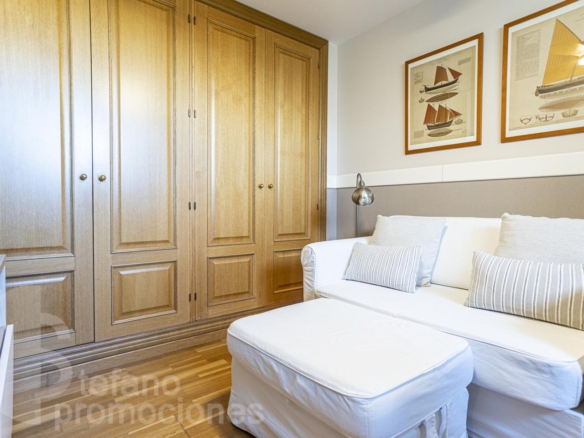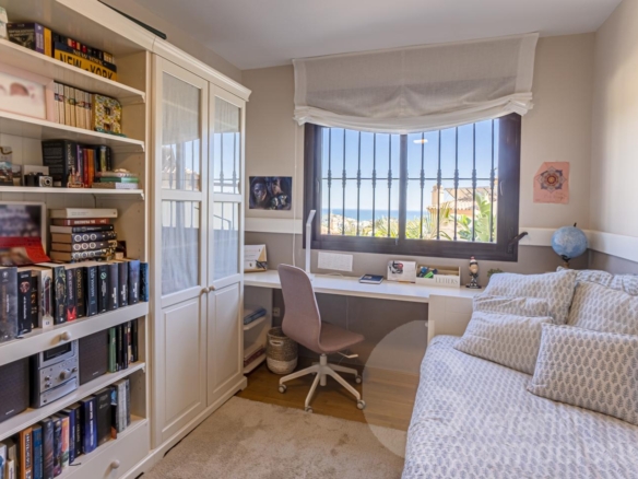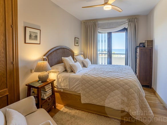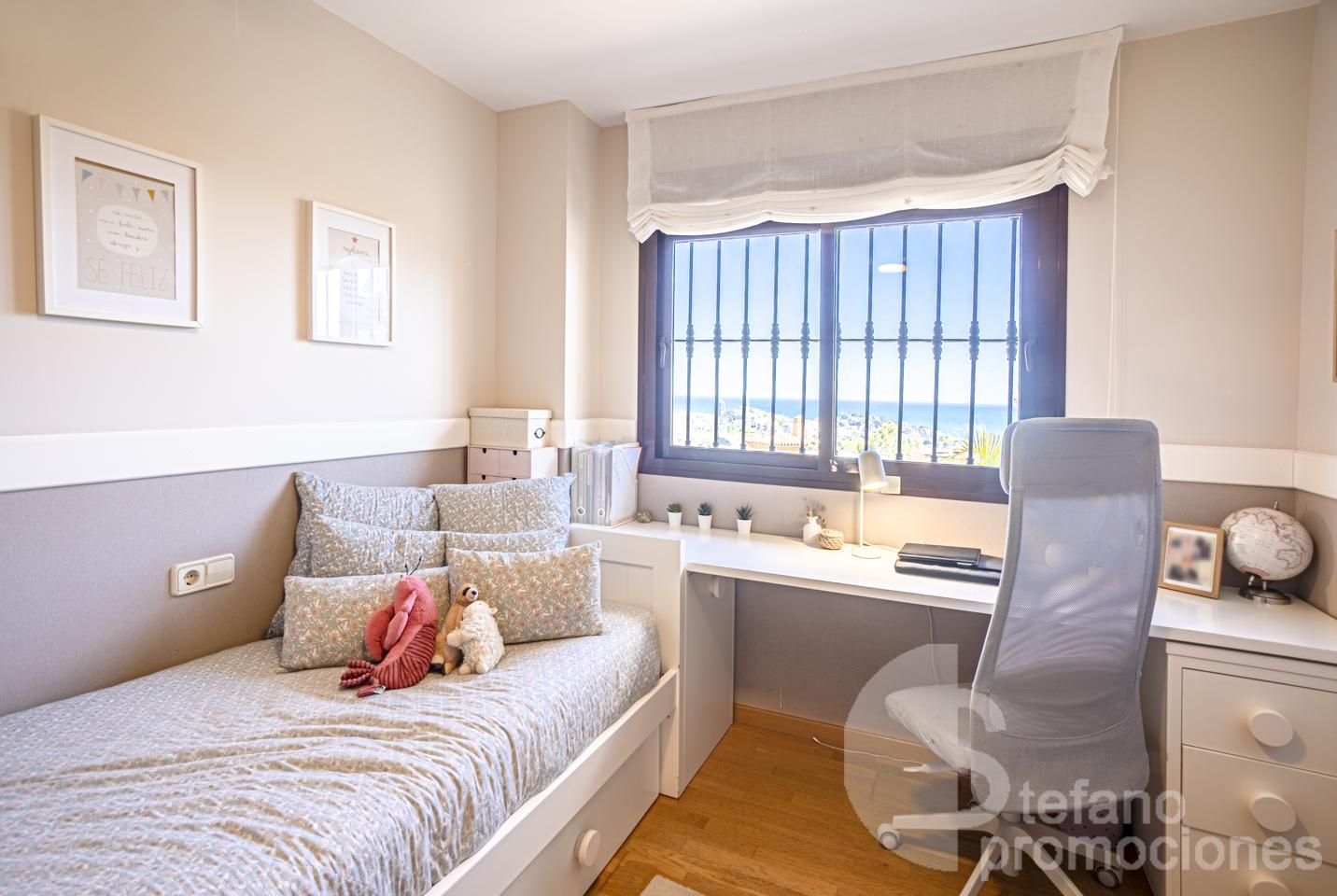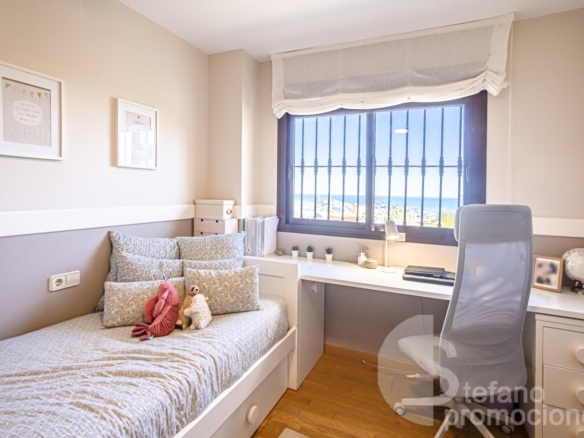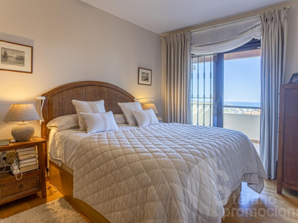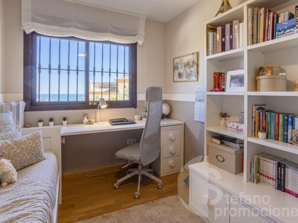 The first floor includes a master bedroom with a large en-suite bathroom, bathtub, shower, dressing room, and access to a terrace with beautiful sea views. Also on this floor are two additional bedrooms with built-in wardrobes and a full bathroom. Notably, the south orientation of the rooms and sea views.
