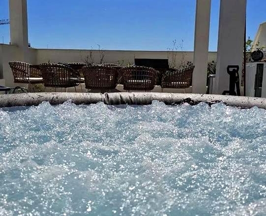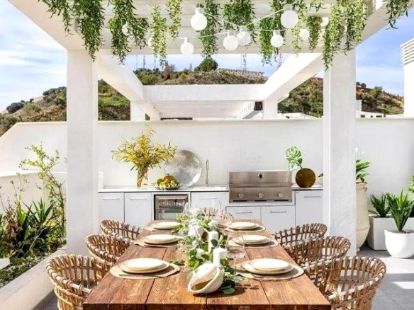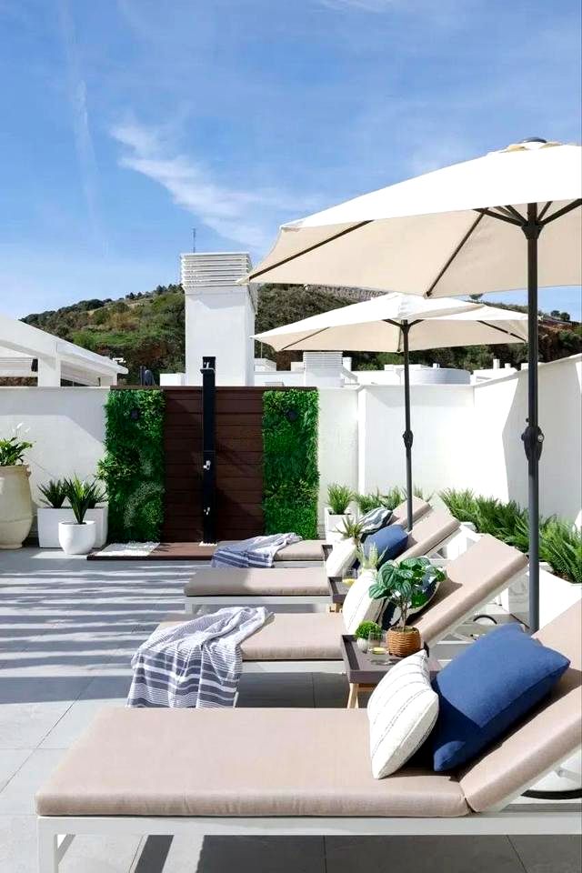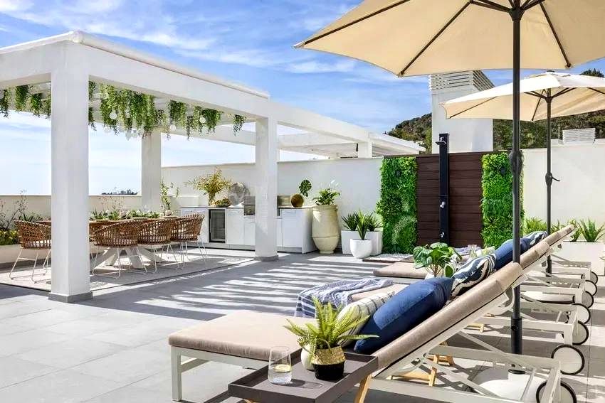 • Impressive fully equipped private solarium: summer kitchen, dining area, outdoor shower, and sunbed space