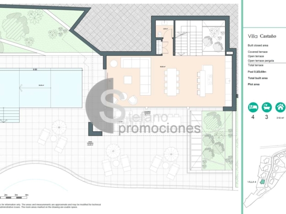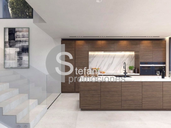 La villa cuenta con cuatro elegantes dormitorios y tres baños modernos, todos diseñados para proporcionar el máximo confort. Su cocina, completamente equipada y personalizable, se integra a la perfección con un comedor sofisticado, ideal tanto para el día a día como para ocasiones especiales. La amplia sala de estar conecta directamente con una terraza orientada al sur, gracias a puertas correderas de vidrio que permiten una transición fluida entre el interior y el exterior.