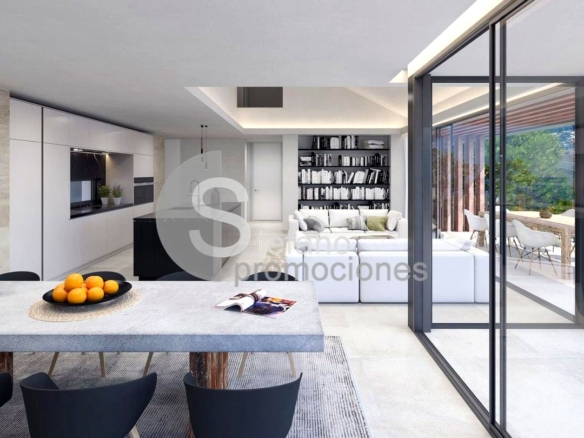 La villa cuenta con cuatro elegantes dormitorios y tres baños modernos, todos diseñados para proporcionar el máximo confort. Su cocina, completamente equipada y personalizable, se integra a la perfección con un comedor sofisticado, ideal tanto para el día a día como para ocasiones especiales. La amplia sala de estar conecta directamente con una terraza orientada al sur, gracias a puertas correderas de vidrio que permiten una transición fluida entre el interior y el exterior.