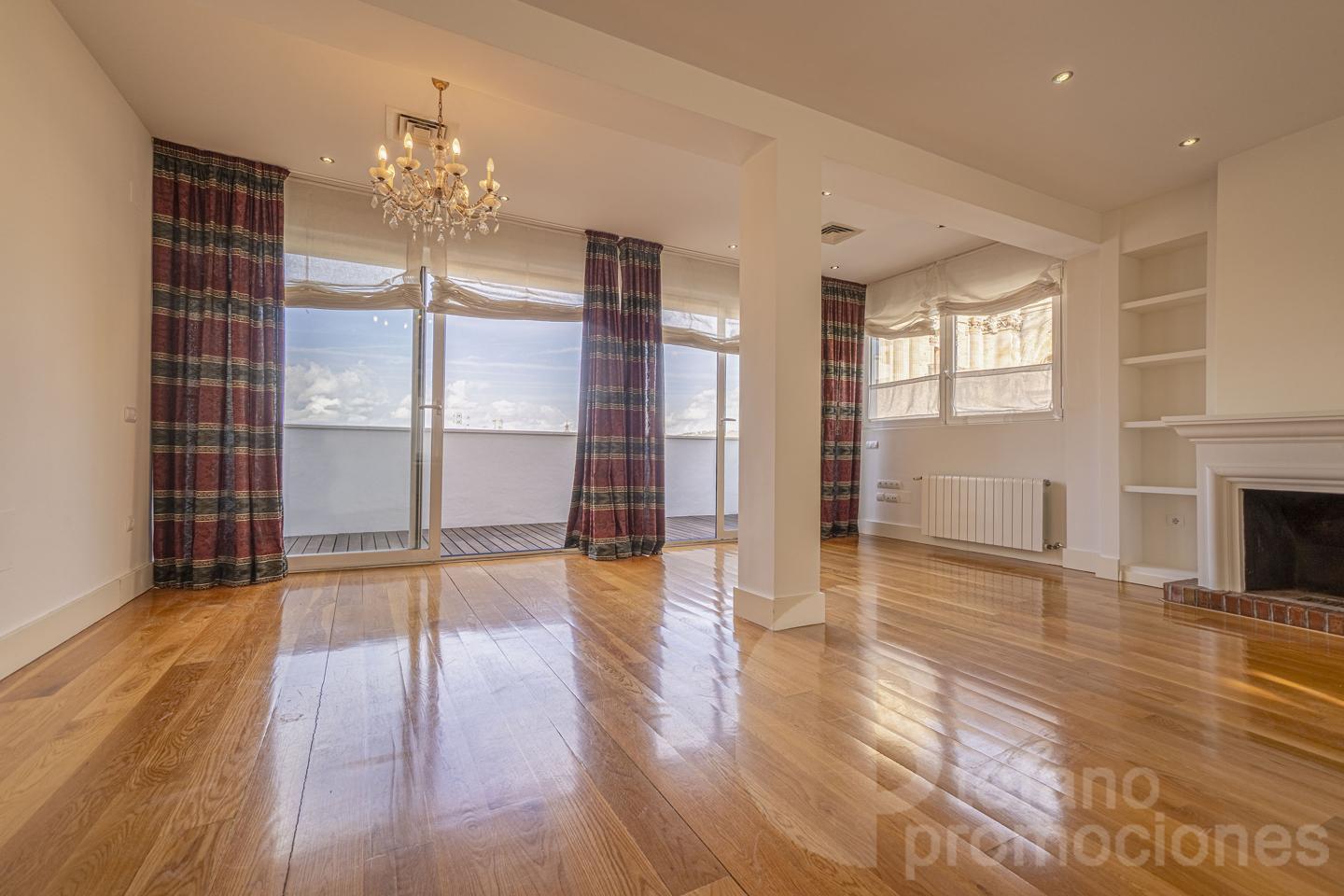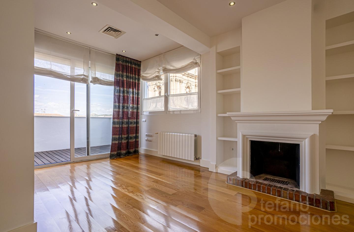 Salón señorial con chimenea y acceso a una encantadora terraza con vistas panorámicas a la catedral y al centro de Málaga.